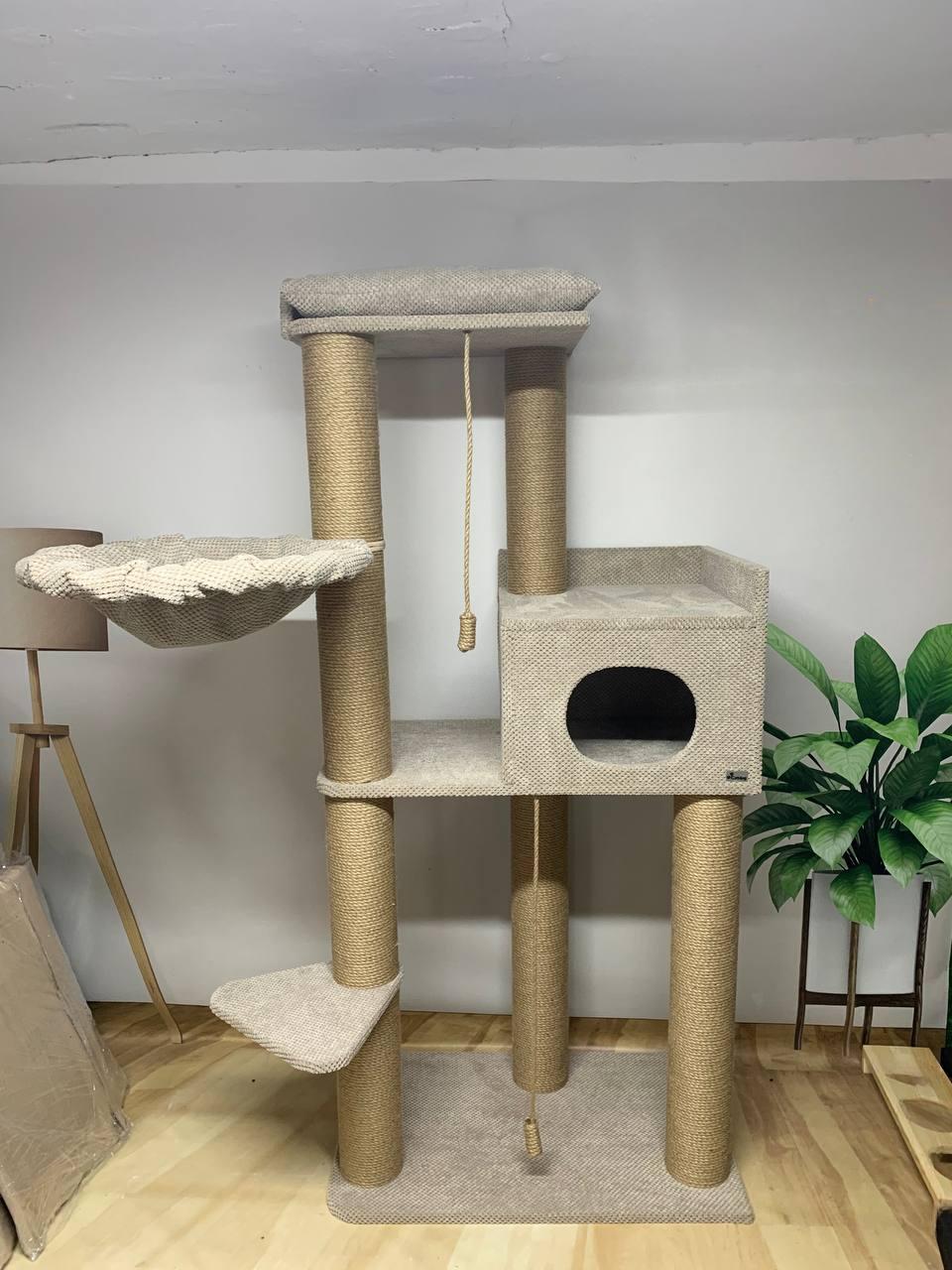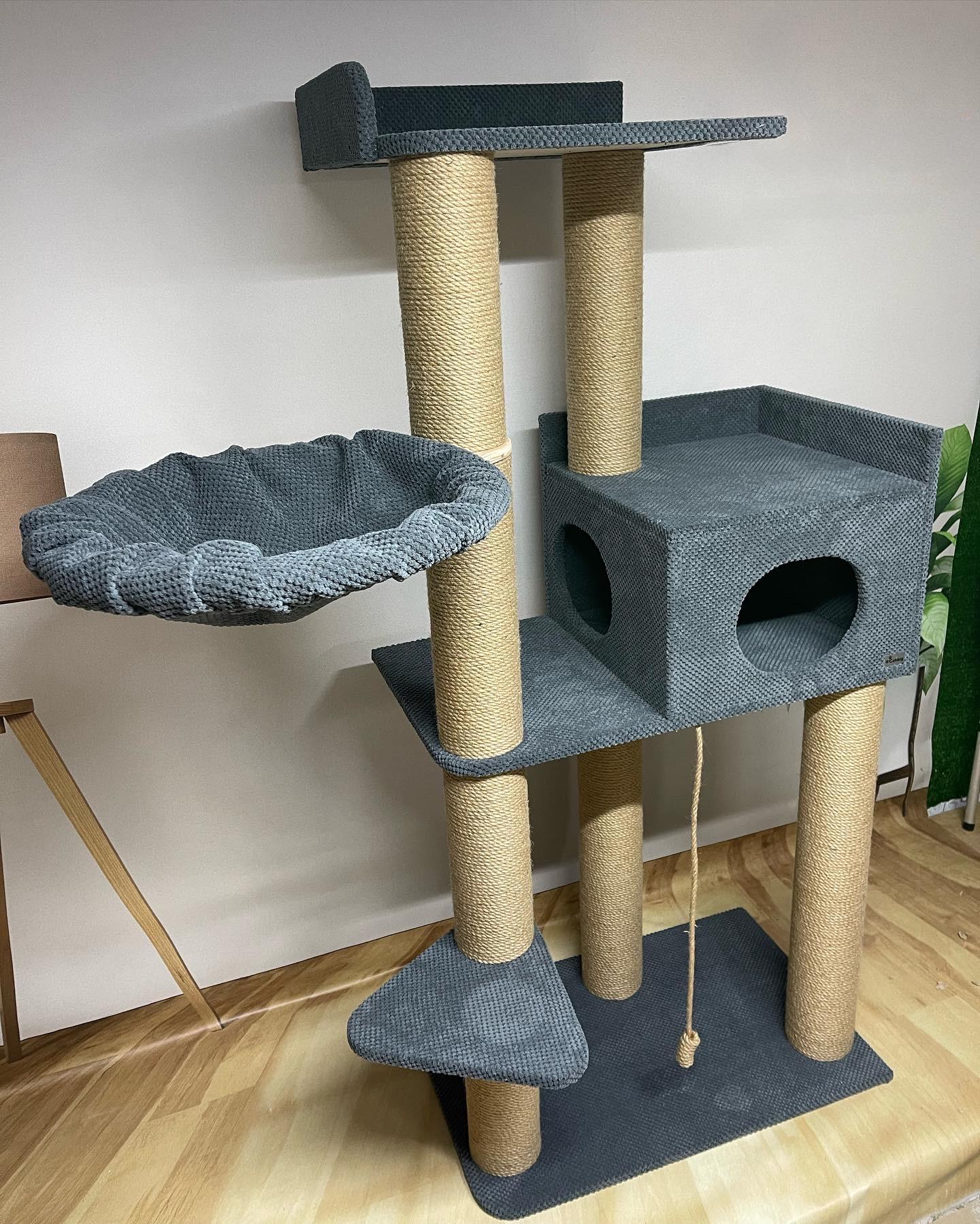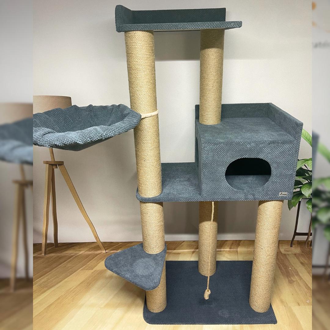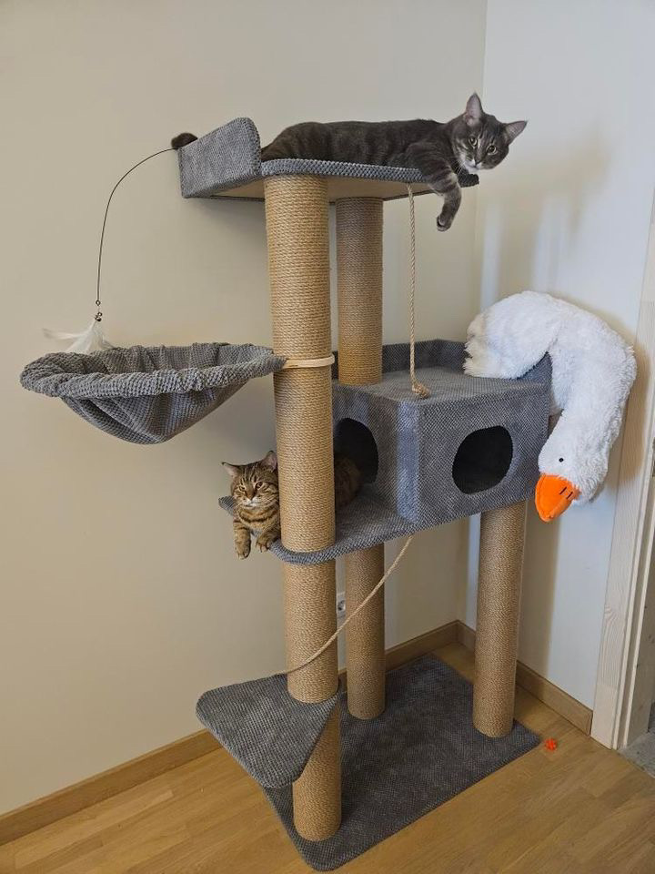 Górny leżak został powiększony do rozmiaru 45*50 cm, aby było wystarczająco dużo miejsca nawet dla tych największych 🐈, a do niego dodano kolejną kolumnę nad domkiem, aby nie trzeba było go mocować do ściany i zachować stabilność całej konstrukcji 👌