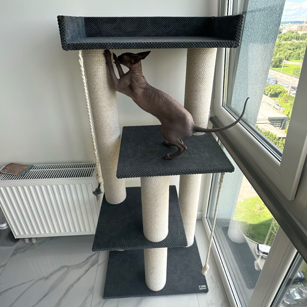 Posiada mnóstwo miejsc do drapania pazurów, zabaw oraz kilka wiszących zabawek do aktywnej zabawy 😉