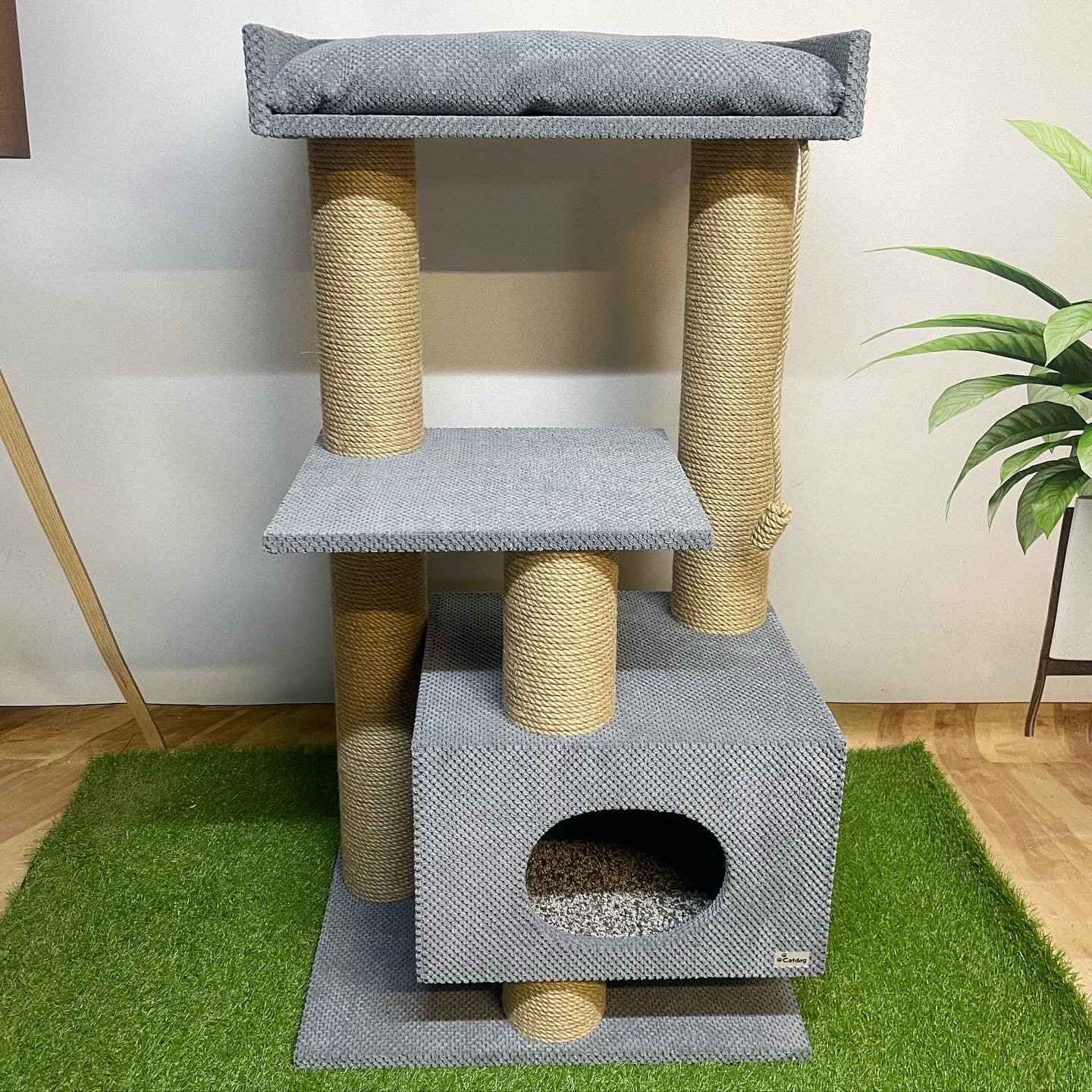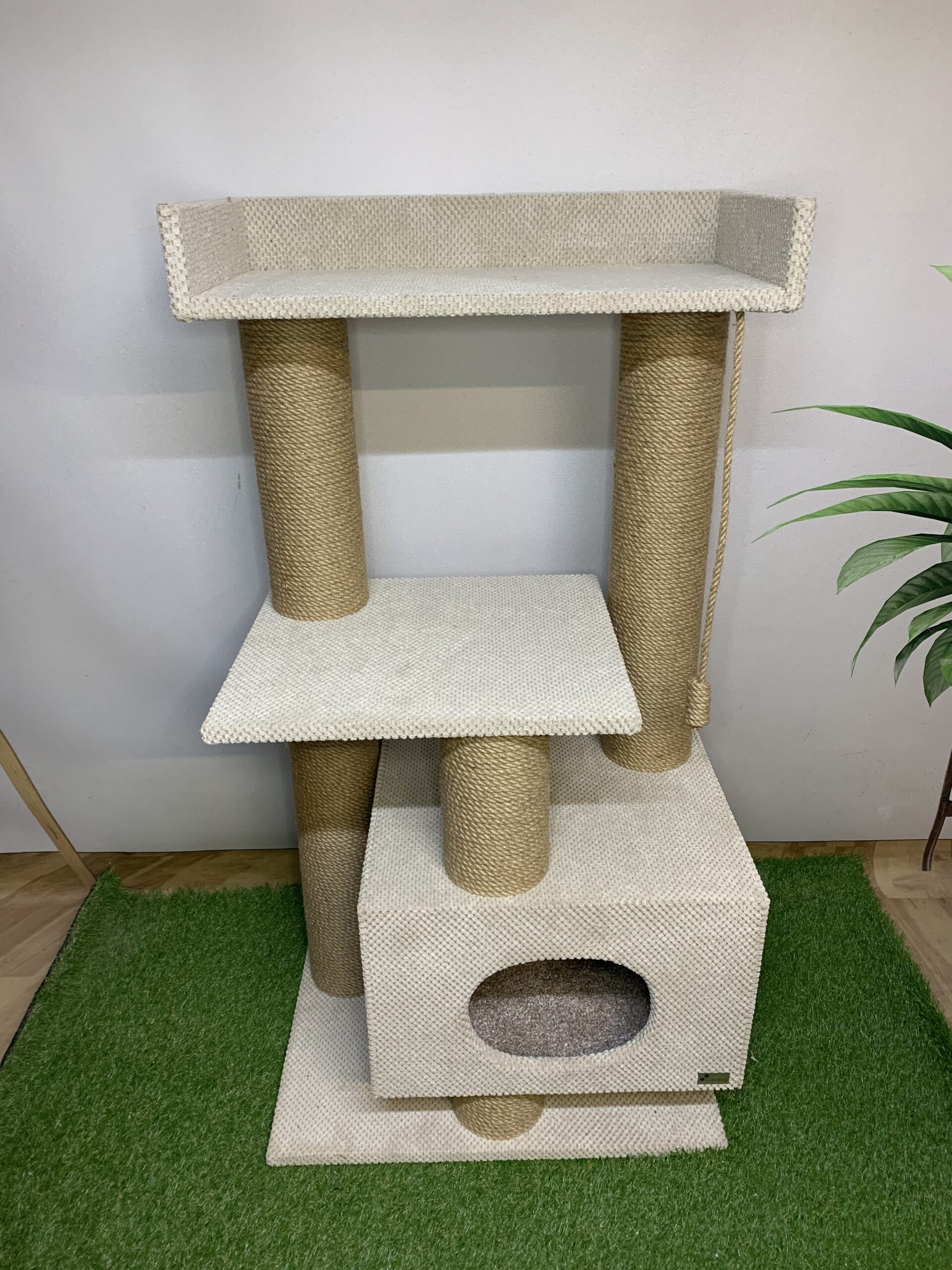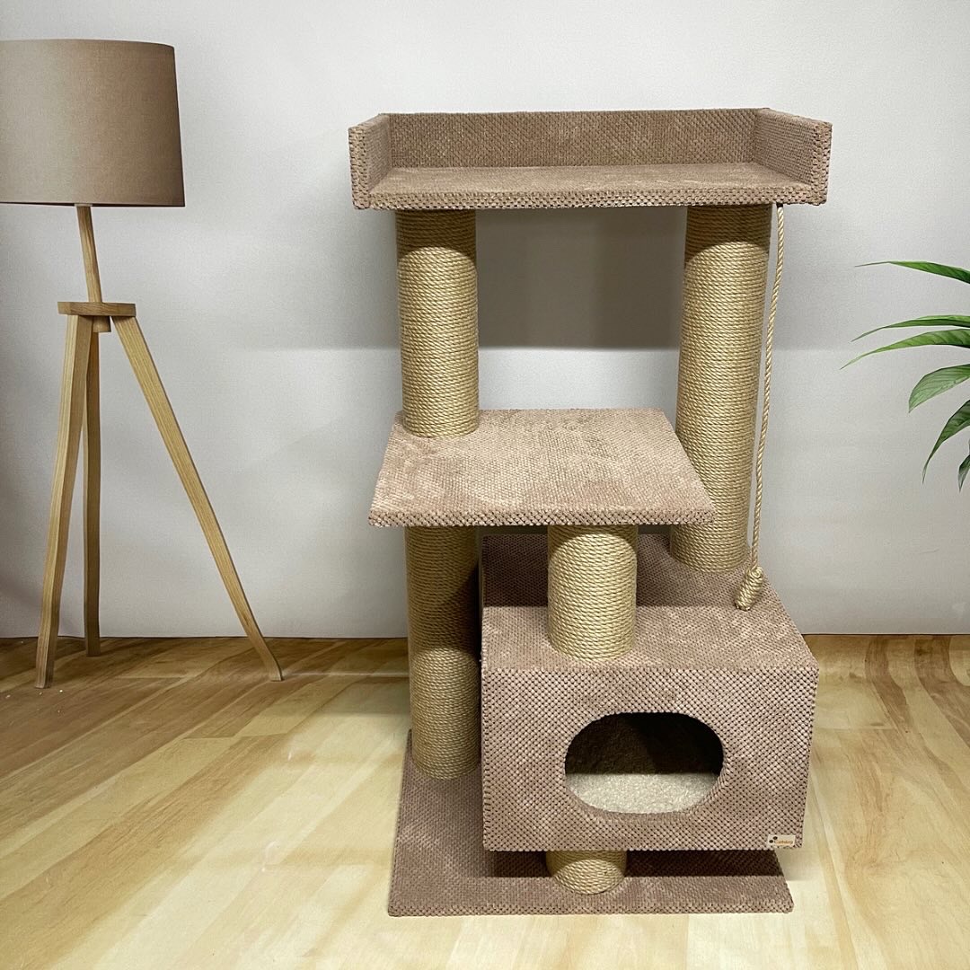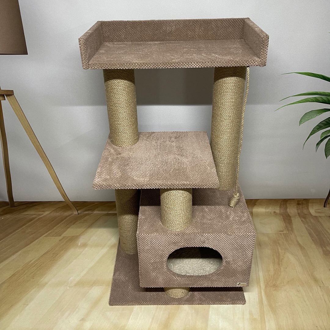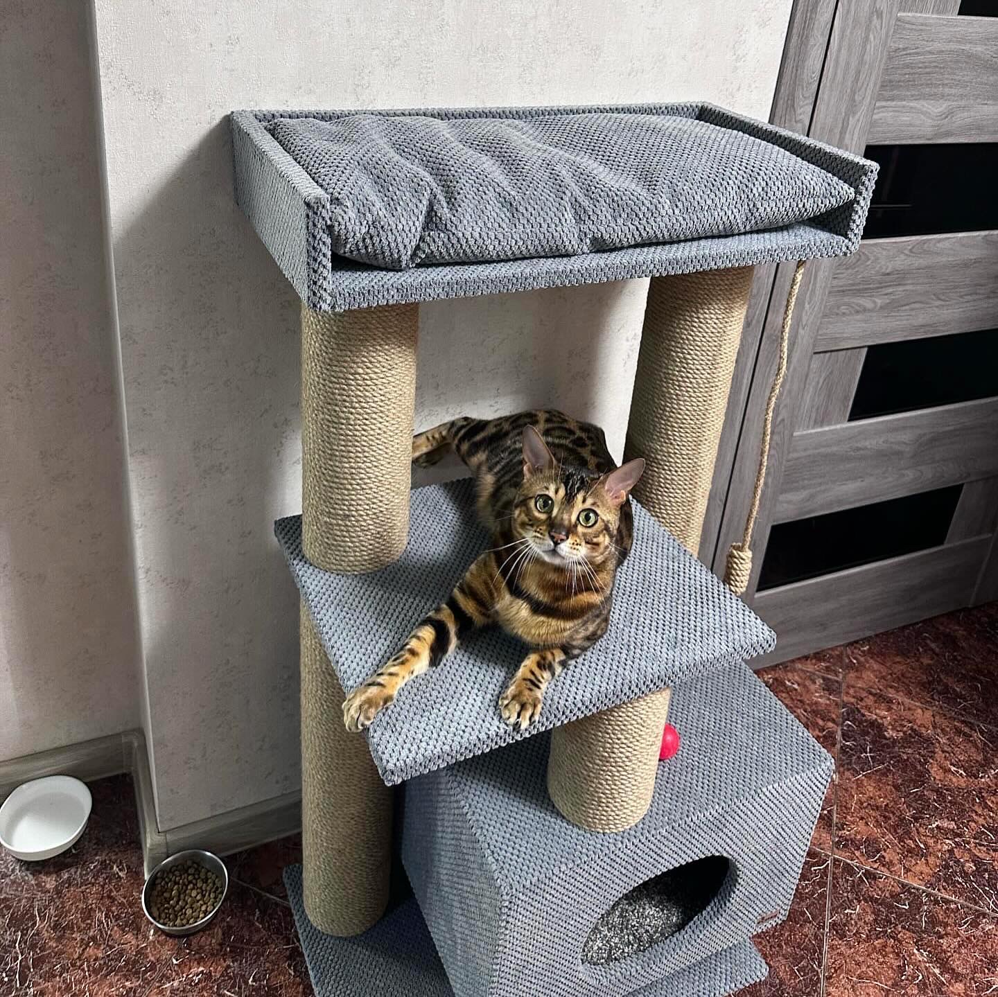 – przestronny domek 45*40 cm (odpowiedni nawet dla dużych kotów o wadze do 8-10 kg) uniesiony nad podłogą, z miękkim dywanem na spodzie