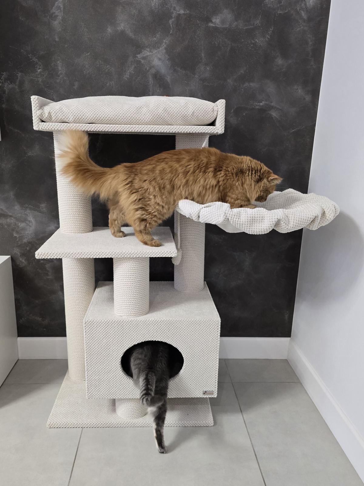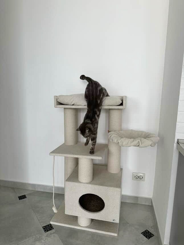 – przestronny domek o wymiarach 45*40 cm (odpowiedni nawet dla dużych kotów o wadze do 8-10 kg) uniesiony nad podłogą, z miękkim dywanikiem na spodzie