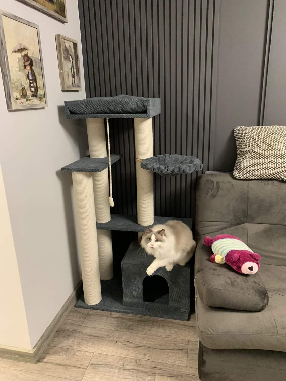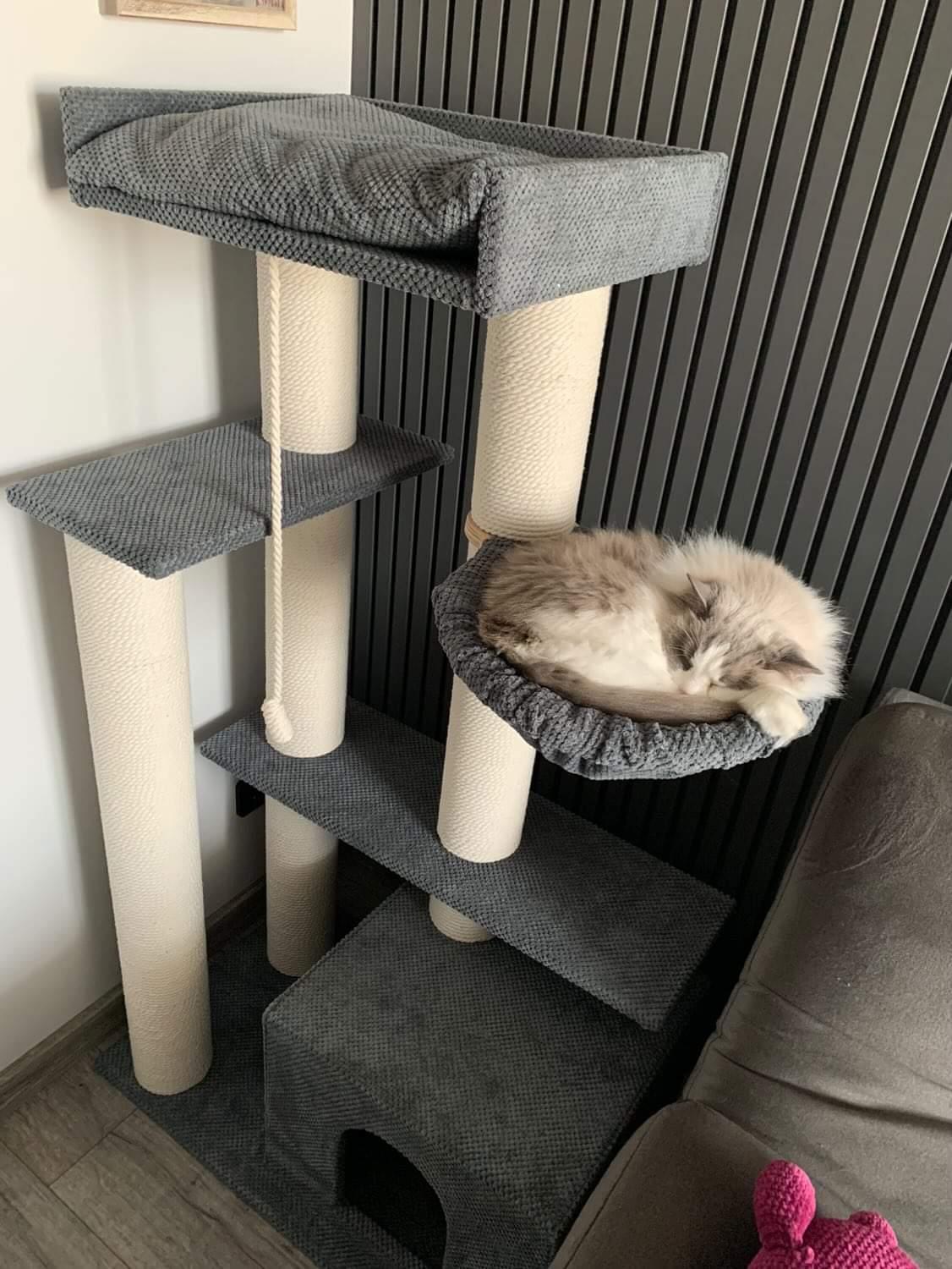 Na dole znajduje się przestronny domek o wymiarach 45*45 cm, a powyżej przytulny hamak i duży leżak o wymiarach 50*40 cm 😺😉.